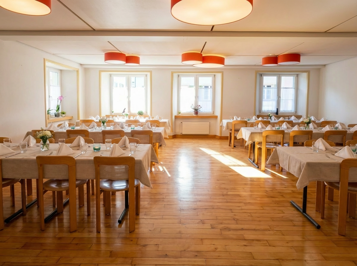 Im Unser Saal im 1. Stock steht für Ihre Feste bereit. Ob Bankett, Geburtstag, Taufe oder Firmenanlass – bei uns finden bis zu 60 Personen Platz und geniessen eine gemütliche Atmosphäre.